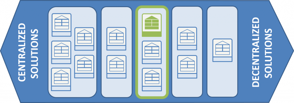 Several distribution circuits are necessary. Several technical rooms may be necessary to install the different heat pumps. Smaller capacity of each heat pump compared to the entire central solution.