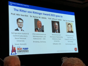 The award highlights outstanding contributions to the advancement of international collaboration in research, policy and market development and applications for energy-efficient heat pumping technologies that result in environmental benefits. It is awarded every three years in conjunction with the International IEA Heat Pump Conference. Mr. Stephan Renz, Chair of the Executive Committee of Technology the Collaboration Programme of Heat Pumping Technologies (HPT TCP) by IEA, presented the awardees: