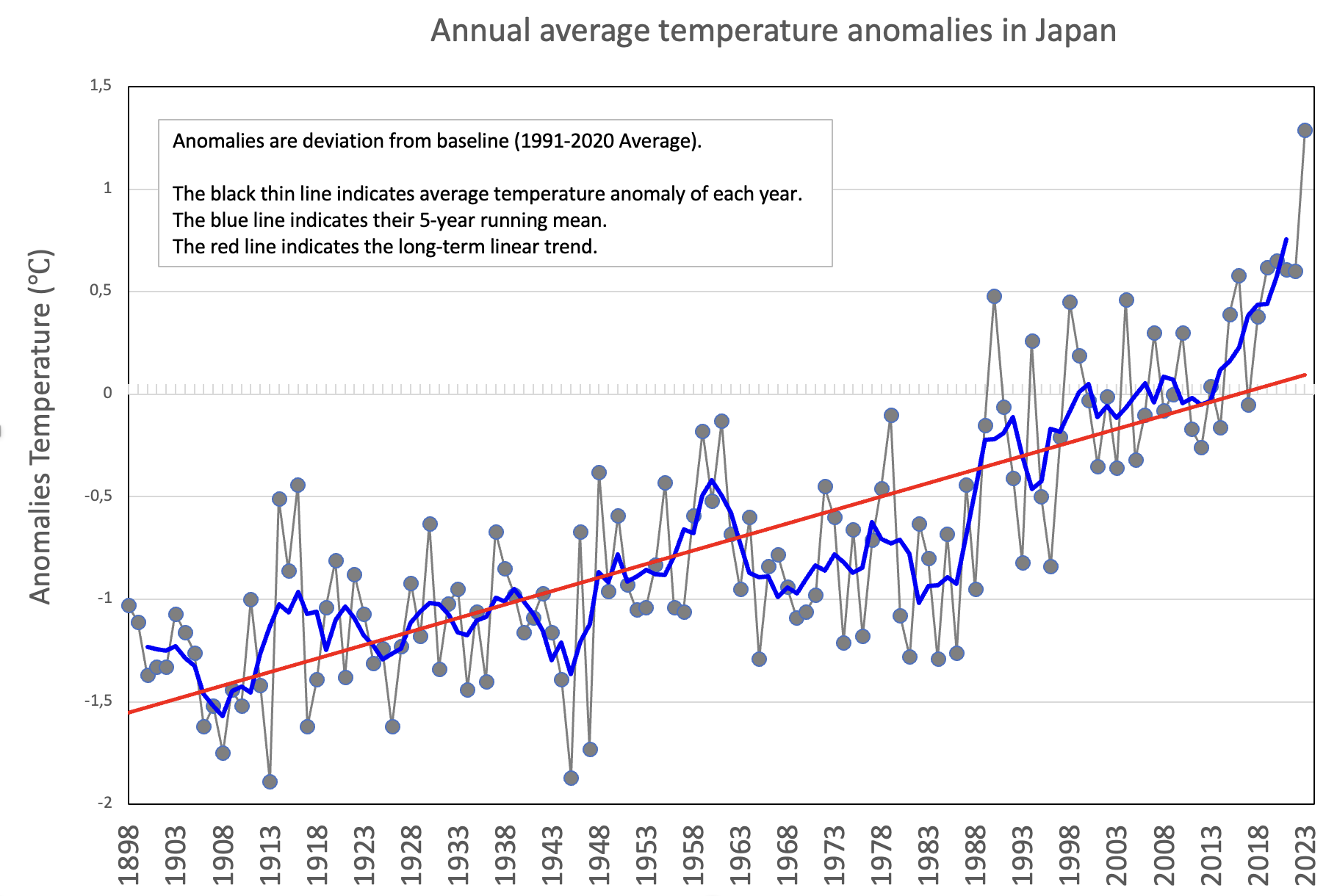 Figure 1 illustrates the average temperature deviation in Japan [1]. In 2023, the deviation from the reference value (a 30-year average from 1991 to 2020) for Japan’s average temperature was +1.29°C, marking the highest recorded since statistics began in 1898, surpassing the figures of 2020. Over time, Japan’s annual average temperature has shown an upward trend, albeit with fluctuations. Long-term data indicates a rise of 1.35°C per century, with a notable increase observed since the 1990s, marked by several years of elevated temperatures.