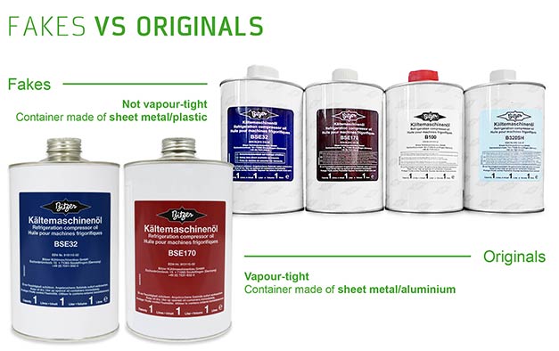 The oils were said to be of vastly inferior quality, whose chemical formulation differed greatly from the originals. In particular, the viscosity characteristics, moisture content and chemical formulation were very different from the original products. Using this fake product can lead to insufficient compressor lubrication, chemical reactions and destruction of elastomers.