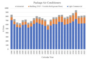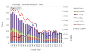 As shown in Figure 7, while shipments of centrifugal chillers have been flat, shipments of absorption-type chillers, regardless of type, have decreased by more than half from 20 years ago [4].