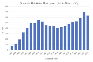 As shown in Figure 3 and Figure 4, the shipment volumes of room air conditioners and package air conditioners are almost flat, and the Japanese market is mainly driven by replacement demand. [4]. As mentioned above, heat pump technology spread mainly in cooling equipment in Japan and was later applied to heating. Air-conditioning equipment manufacturers are working on the development of equipment specialized for improving heating efficiency for cold regions, and are also making efforts to popularize heat pump equipment in cold regions, including hot water supply.