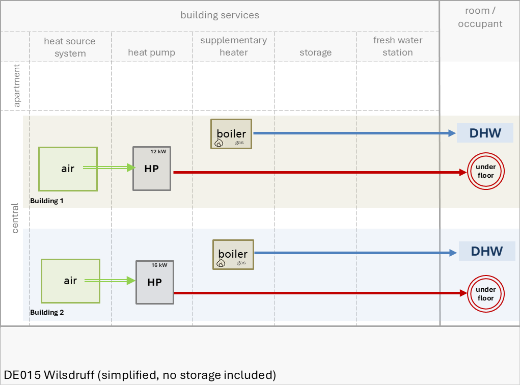 Space Heating (SH) is provided in each building by a central heat pump. Additionally a gas condensing boiler is equipped in each MFB that serve purely for the production of DHW.