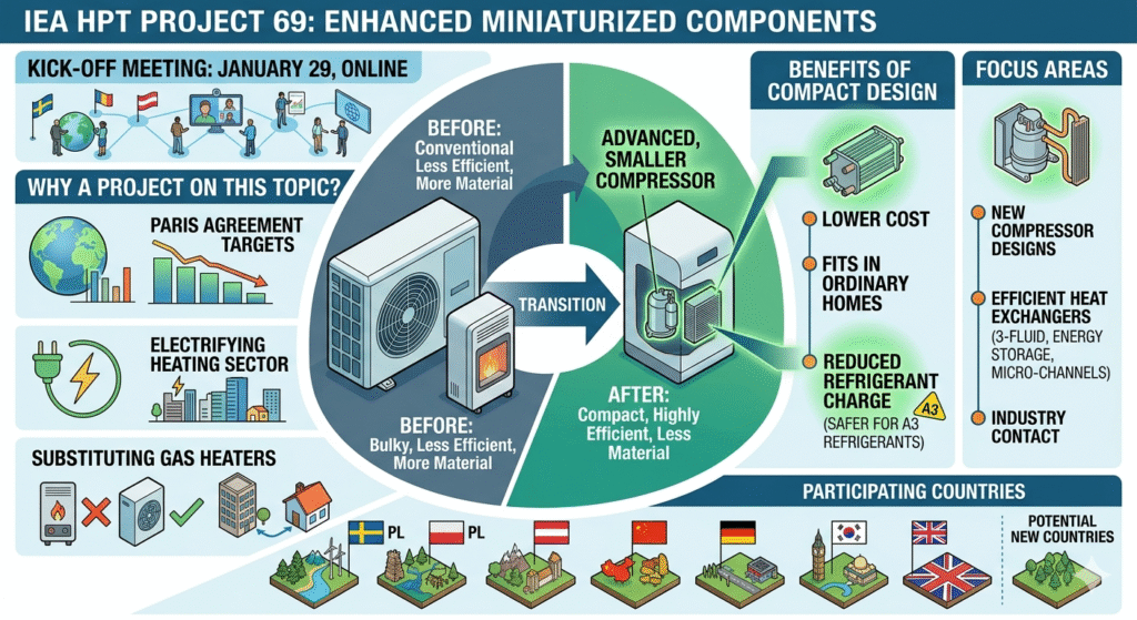 On January 29, the first meeting of the new Project 69 was held online. This new project, entitled Enhanced miniaturized components, aims to support the development of new heat pump components that are less costly, smaller, and highly efficient. All types of components are within the scope of the project, but the main focus will be on compressors and heat exchangers.